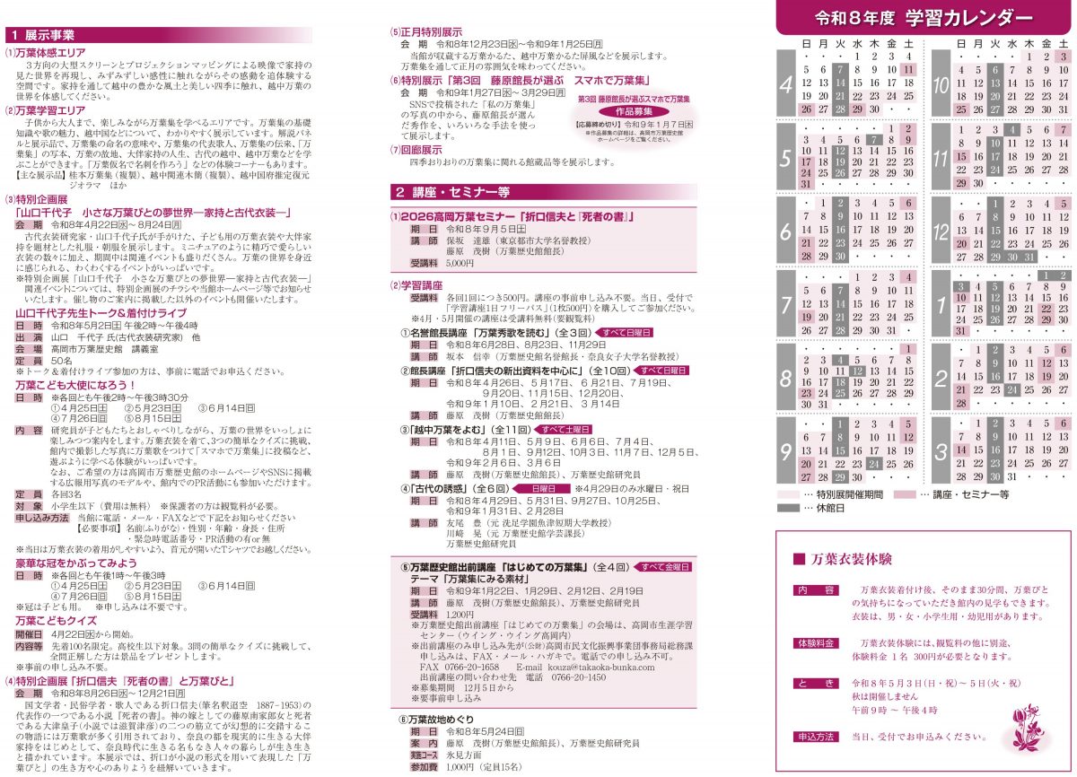令和8年度高岡市万葉歴史館の催し物(スケジュール)のご案内(パンフレット)
